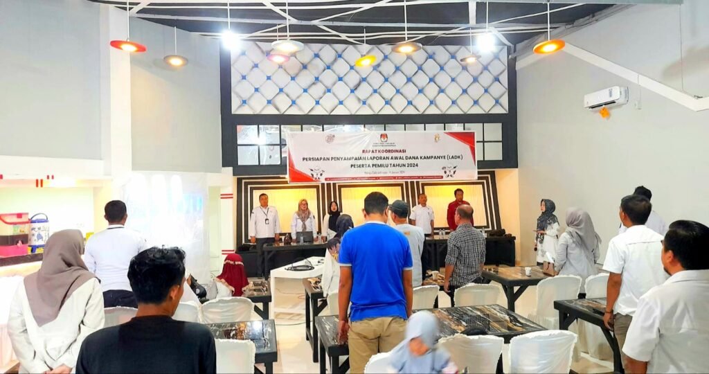Kegiatan rapat koordinasi persiapan penyampaian laporan awal dana kampanye (LADK) peserta pemilu tahun 2024 ini di buka langsung oleh ketua KPU kabupaten Gorontalo Roy Hamrain.