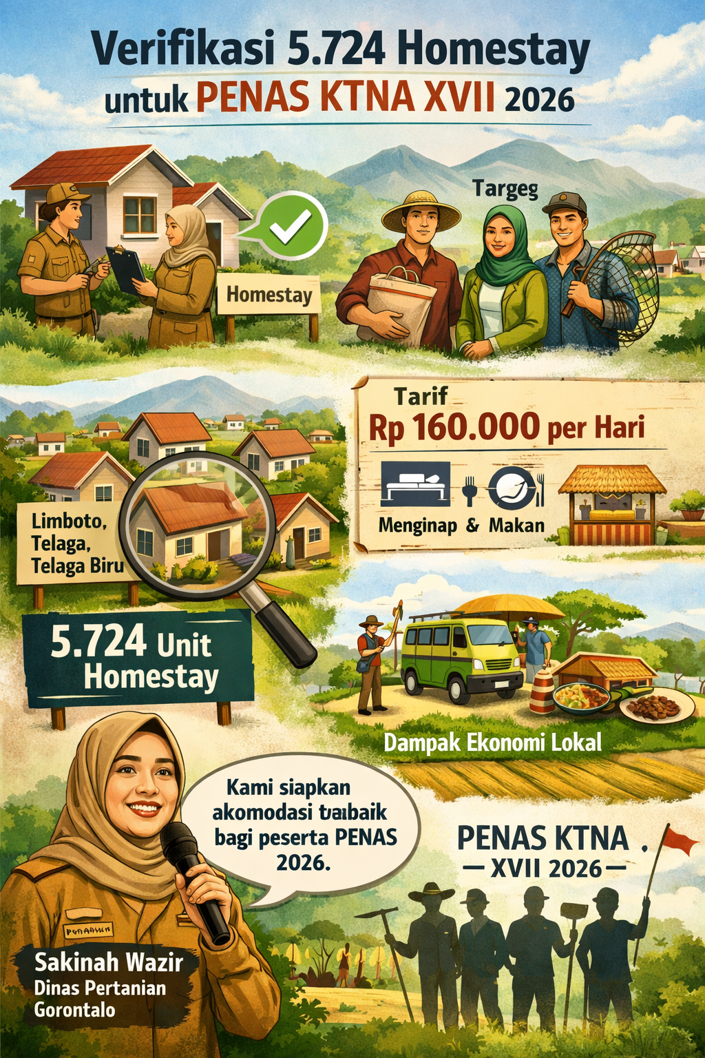 maleonews.com, GORONTALO – Pemerintah Kabupaten (Pemkab) Gorontalo terus mematangkan persiapan penyelenggaraan Pekan Nasional (PENAS) Kontak Tani Nelayan Andalan (KTNA) XVII Tahun 2026, khususnya pada sektor akomodasi peserta.