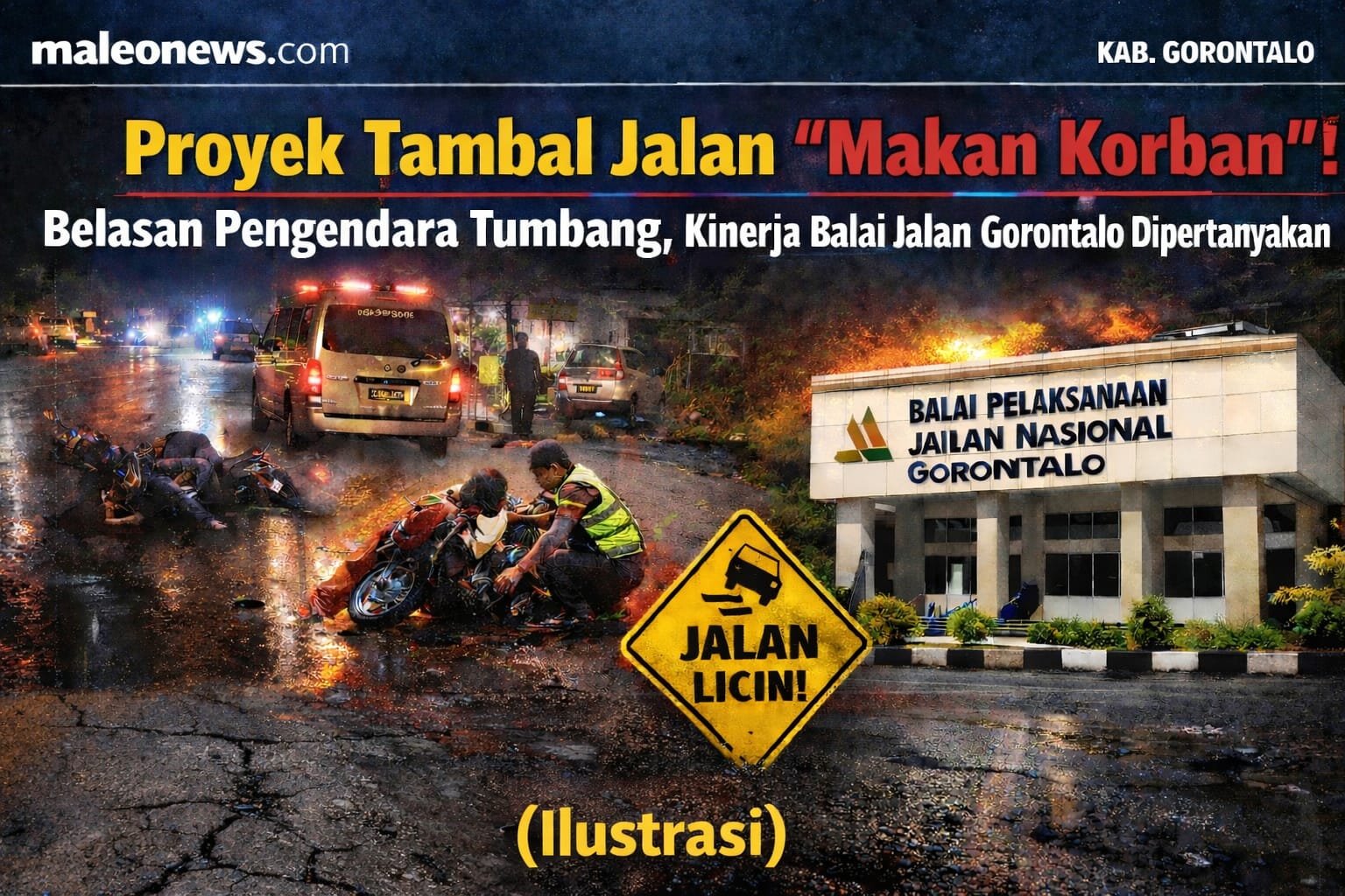 maleonews.com, Kab. Gorontalo – Proyek penambalan jalan yang dikerjakan Balai Pelaksanaan Jalan Nasional Gorontalo menuai sorotan tajam setelah memicu rentetan kecelakaan di ruas Jalan Achmad A. Wahab, Kecamatan Telaga, Selasa (28/04/2026) sekitar pukul 20.00 WITA. Belasan pengendara roda dua dilaporkan terjatuh di lokasi yang sama, diduga akibat kondisi jalan yang licin usai pengerjaan tambal aspal.